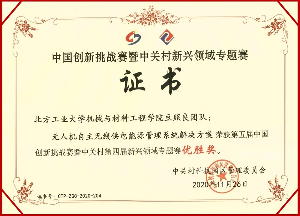 (2)在科技部火炬中心、中关村科技园区管理委员会、国防科工局信息中心、军队及军工单位等相关需求主体主办的第五届中国创新挑战赛暨中关村第四届新兴领域专题赛中,提交的“无人机自主无线供电能源管理系统解决方案”,获得优胜奖(证书号:CTP-ZGC-2020-204),并获技术需求方科研合同订单,一期合同金额98万元已进入合同流程。
