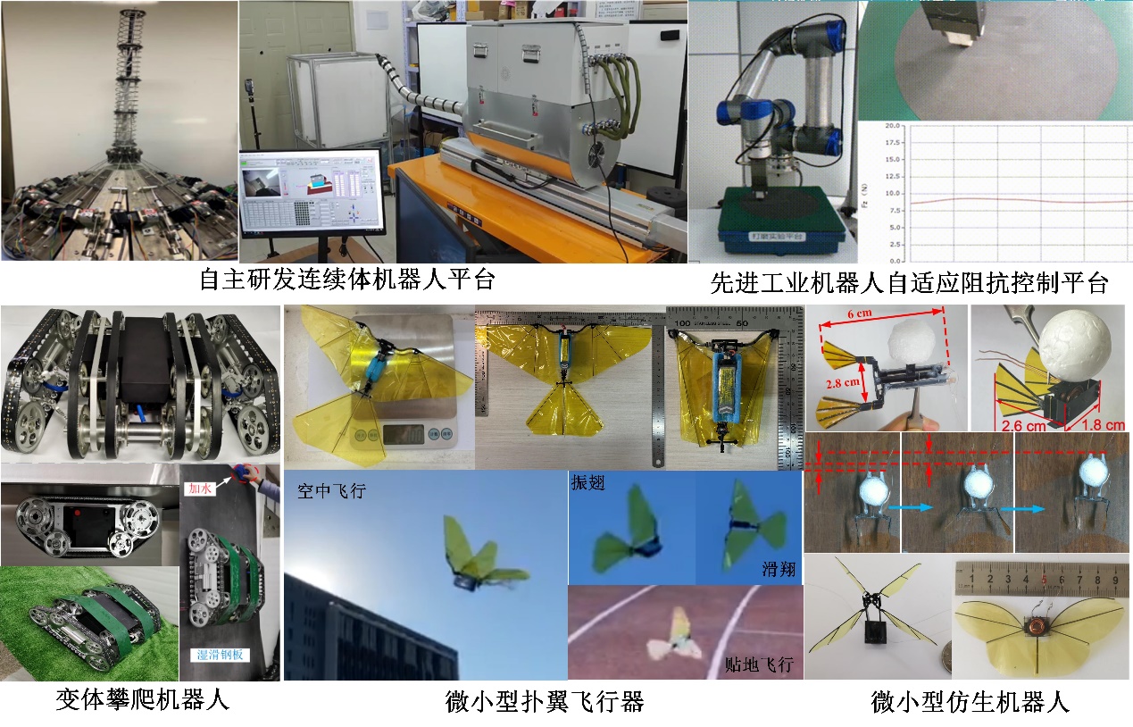 团队拥有多台自主研发的连续体机器人,先进串、并联机器人,以及飞行、水下、地面移动机器人样机及测试平台,用于支撑先进机器人机构学、运动学与动力学、控制理论与测控技术方向的研究。微机电系统技术实验室拥有光刻机、ICP刻蚀机、多靶磁控溅射台、PECVD设备、高精度激光加工设备、激光多普勒测振仪、原子力显微镜、矢量网络分析仪等微纳量级高精度加工设备与测试设备,为团队科学研究和人才培养提供保障。
