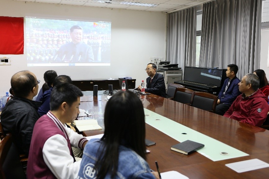 在会上,李强院长首先让大家回忆一下国庆阅兵上出现的各个方阵和军队配备的武器,听取大家观看阅兵的感受,接着和大家分享阅兵中深有感触的片段。李强院长一边播放阅兵视频,一边分享自己的感悟。