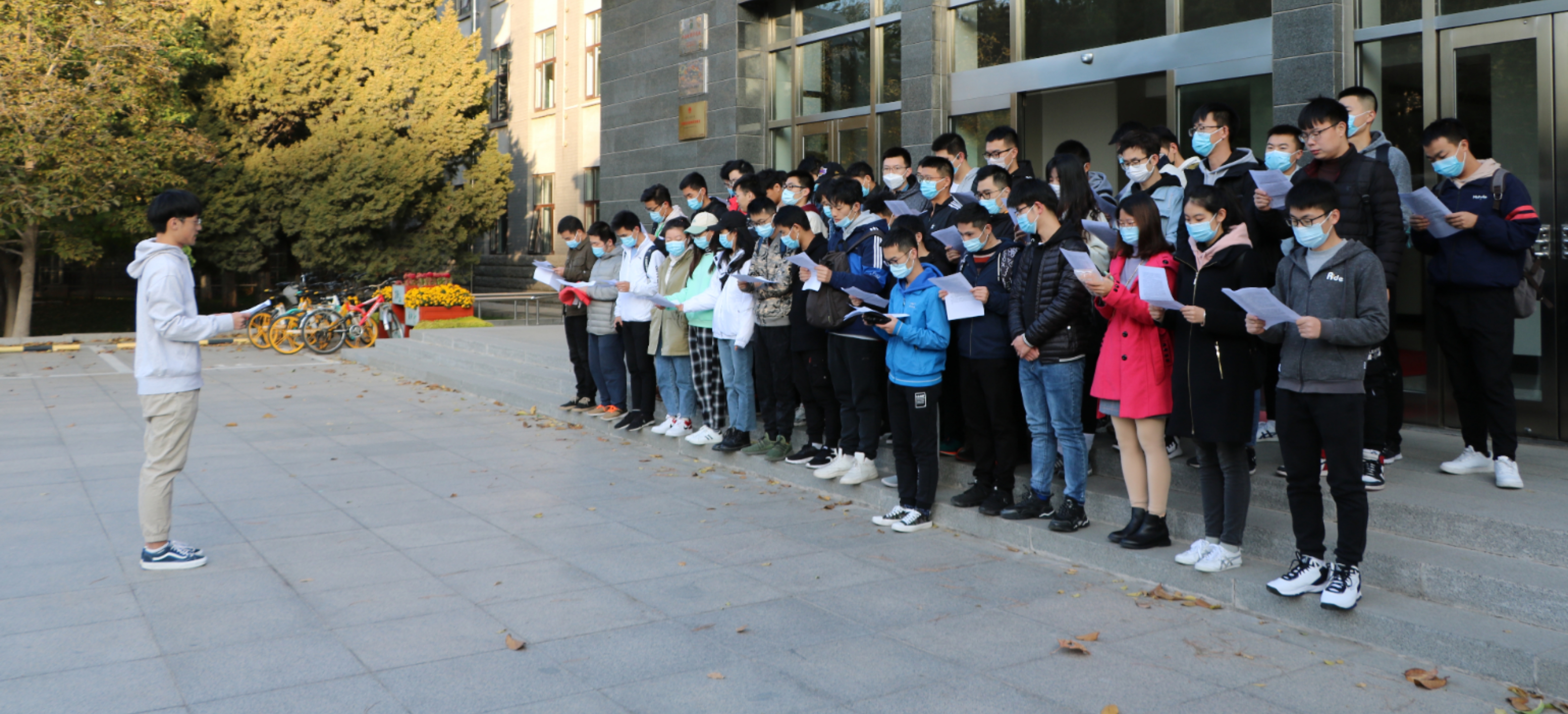 清晨,参加此次活动的全体党员和入党积极分子在敦品楼前集合,党支部首先组织大家奏唱国歌,其次学习习近平总书记在纪念中国人民志愿军抗美援朝出国作战70周年大会上的重要讲话,最后重温入党誓词,随后全体党员和入党积极分子乘地铁前往军事博物馆。