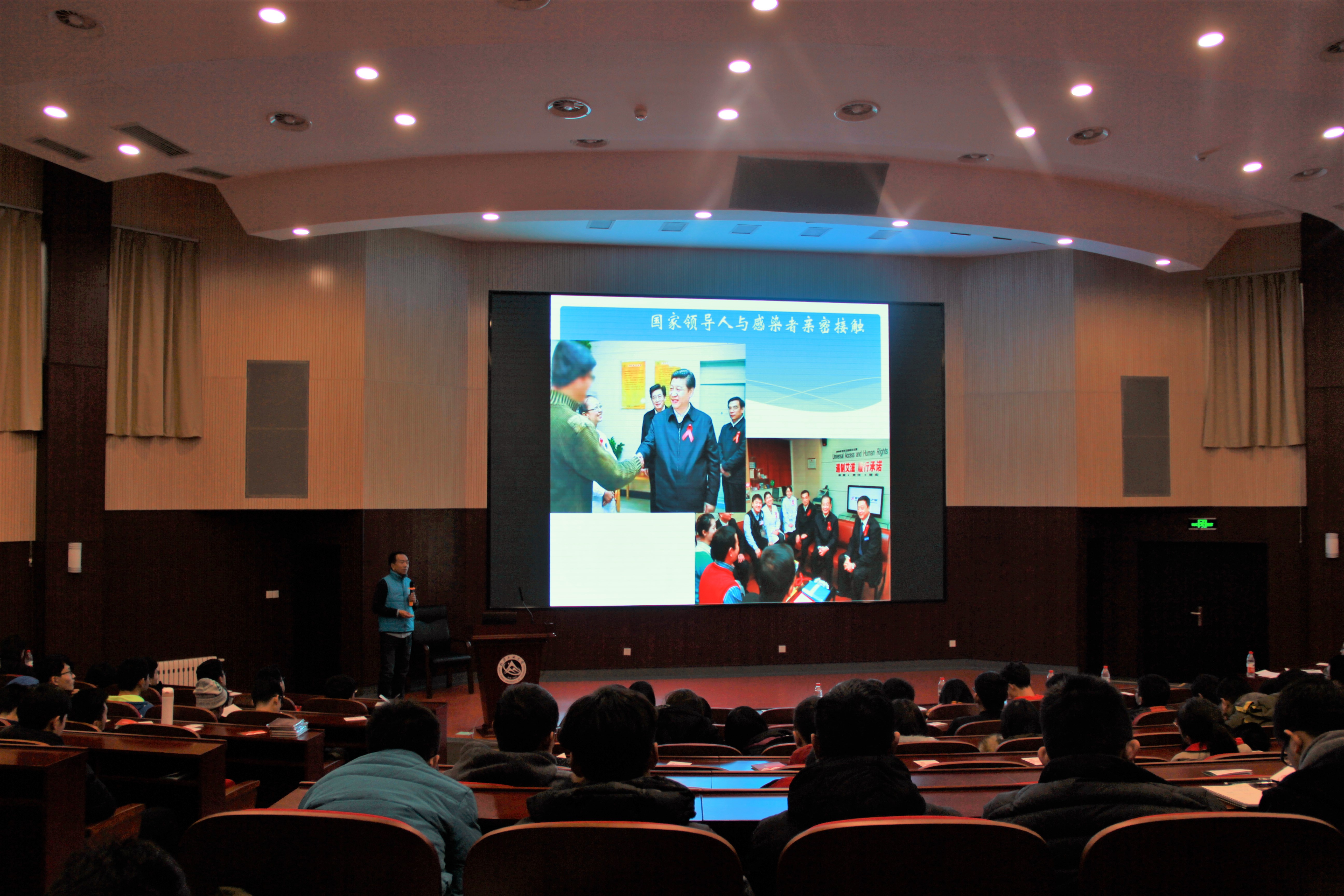 随后,高校行活动讲师李卓为我们介绍了艾滋病的基础知识,讲述了艾滋病的由来、目前状况、以及如何做好艾滋病的预防工作。接下来,李一龙老师登台,结合志愿者分享的故事,小到平民百姓、大到国际领导,为我们讲述了红丝带之家在艾滋病防治工作上做出的杰出贡献。本次讲座还设置了许多互动环节,为师生们准备了许多精美礼品。会议结束后,全体到场同学合影留念。