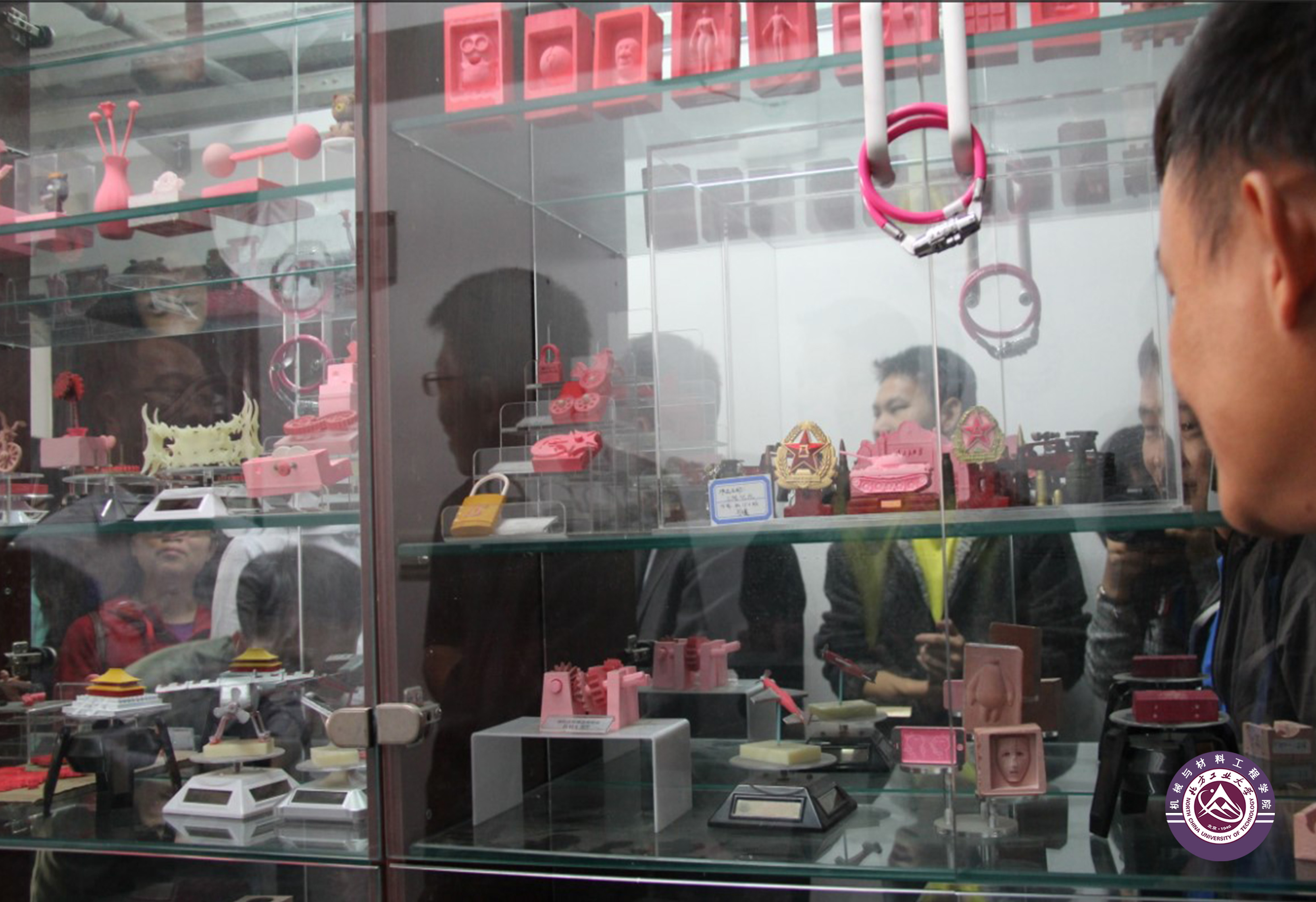校友参观在校同学设计和用CAM方法制作的各种工件和纪念品