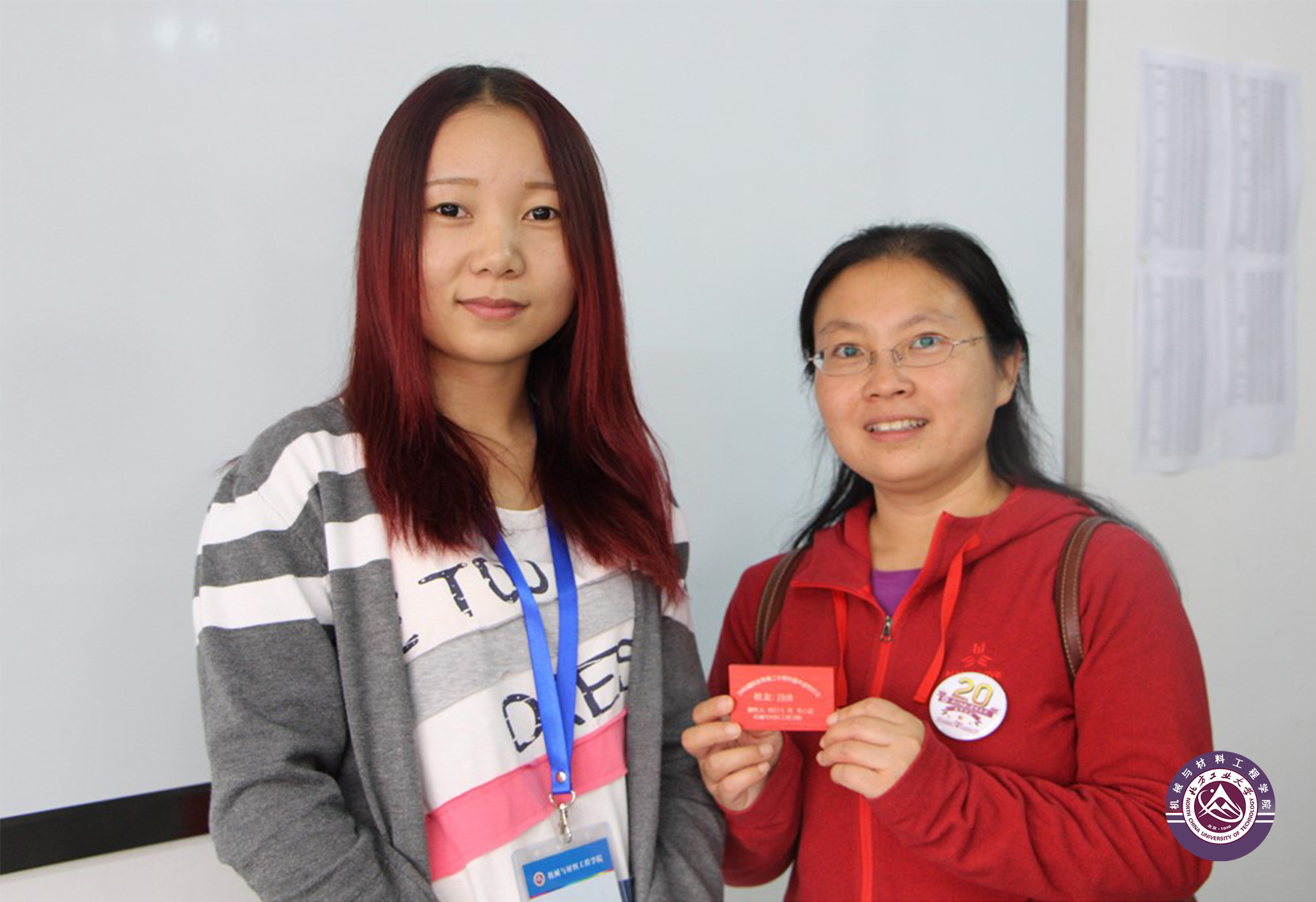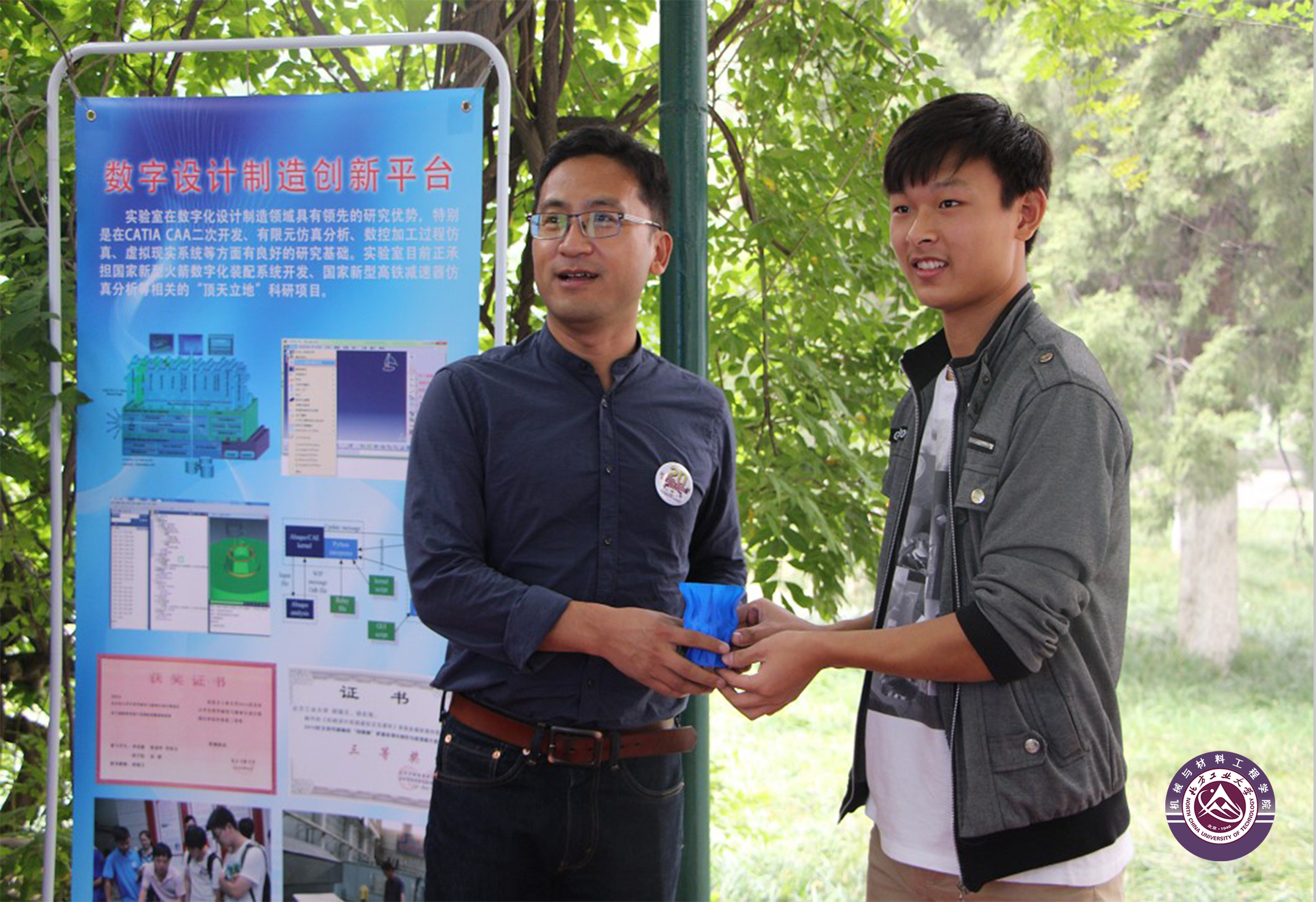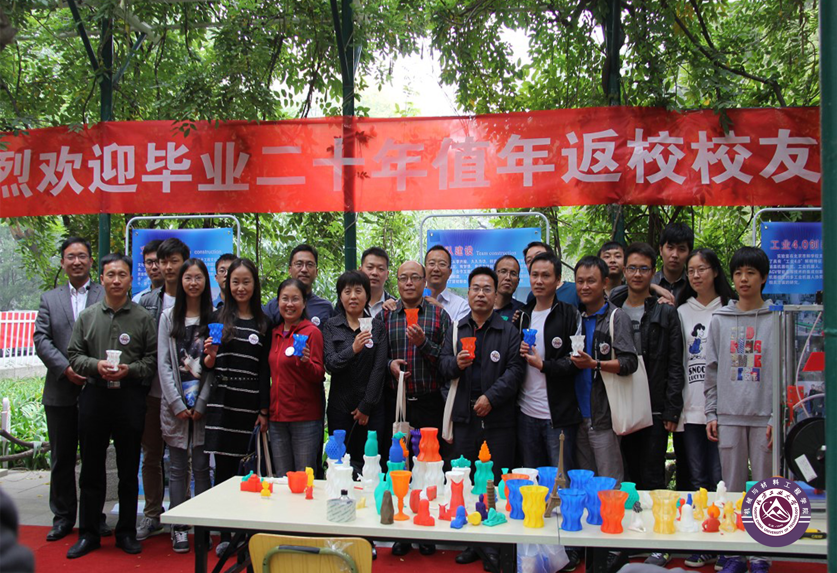 在CNC技术中心,参加中心大学生创新实践活动的在校同学们向每位来校校友们赠送了自己设计和制作的3D打印纪念杯,每个杯上都用激光雕刻了校友的名字以做永久的纪念;在CAD/CAM实验室,在校同学用学到的CAM数控加工方法,专门雕刻了特别设计的活动纪念牌,在纪念牌正面刻上了北方工业大学校徽,背面专门雕刻了校友的名字和制作该纪念牌的同学自己的专业、班级和姓名,亲自赠送给校友。校友们对学弟、学妹们赠送纪念杯和纪念牌爱不释手,详细询问了制作方法,对各种先进的数控实验装置表现出非常浓厚的兴趣,并与学弟学妹们交流了20年前在校学习的体会,鼓励大家珍惜时光、珍惜当前的条件,为将来的成才成业奠定好基础。