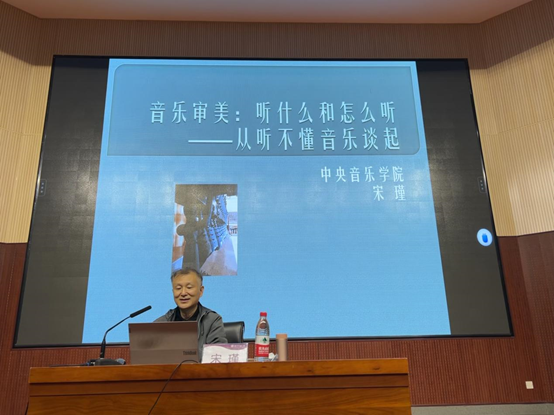 在本次讲座中,宋瑾教授分析了大家“听不懂音乐”的原因,从各种音乐类型、审美状态和审美标准等方面向大家讲述了音乐欣赏的相关知识。在报告中,宋瑾教授引用了大量经典音乐作品,分析了不同时期不同流派不同风格音乐的特点,给大家展示了一个丰富的音乐世界。他还引导大家思考音乐排行榜的“价值”、AI“创作”的作品是否还是音乐作品等问题。他说,音乐表达着丰富的情感内容;欣赏音乐能给人带来审美的愉悦,让人获得心灵的陶冶和感受到人生的情趣,并培养起对美的热爱。他鼓励大家多听音乐,在“听”中获得对音乐的直接感受,积累对音乐的审美经验,从而提高对音乐的欣赏水平。