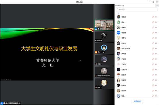 4月28日下午,机械与材料工程学院在线上举办了2022年度新工科人文讲堂第一讲——“大学生文明礼仪与职业发展”,特邀首都师范大学美学教授、博士生导师史红主讲。机械与材料工程学院120余名师生参加了本次讲座。学院党委书记王文革主持了讲座。