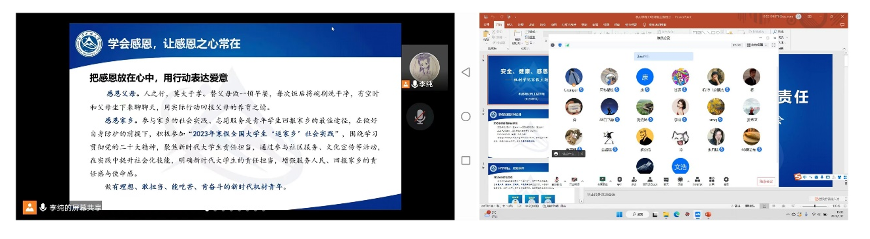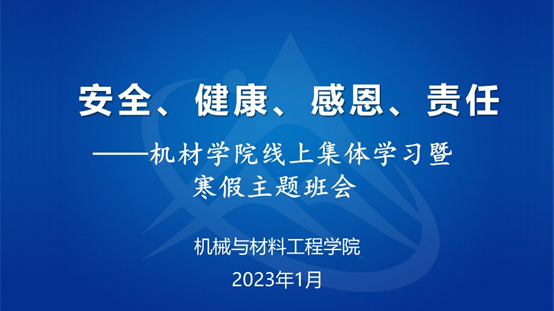 为贯彻落实学校《关于2023年元旦、寒假放假工作安排的通知》文件要求,帮助同学们合理规划大学生涯,进一步增强安全意识、底线意识,引导同学们度过一个充实又有意义的寒假。2023年1月16日至20日,beat365正版唯一入口必一面向全体本科生、研究生组织各班开展了以“安全、健康、感恩、责任”为主题的线上集体学习暨寒假主题班会和研究生组会,确保寒假期间学生工作开启“不断线、常更新”模式。