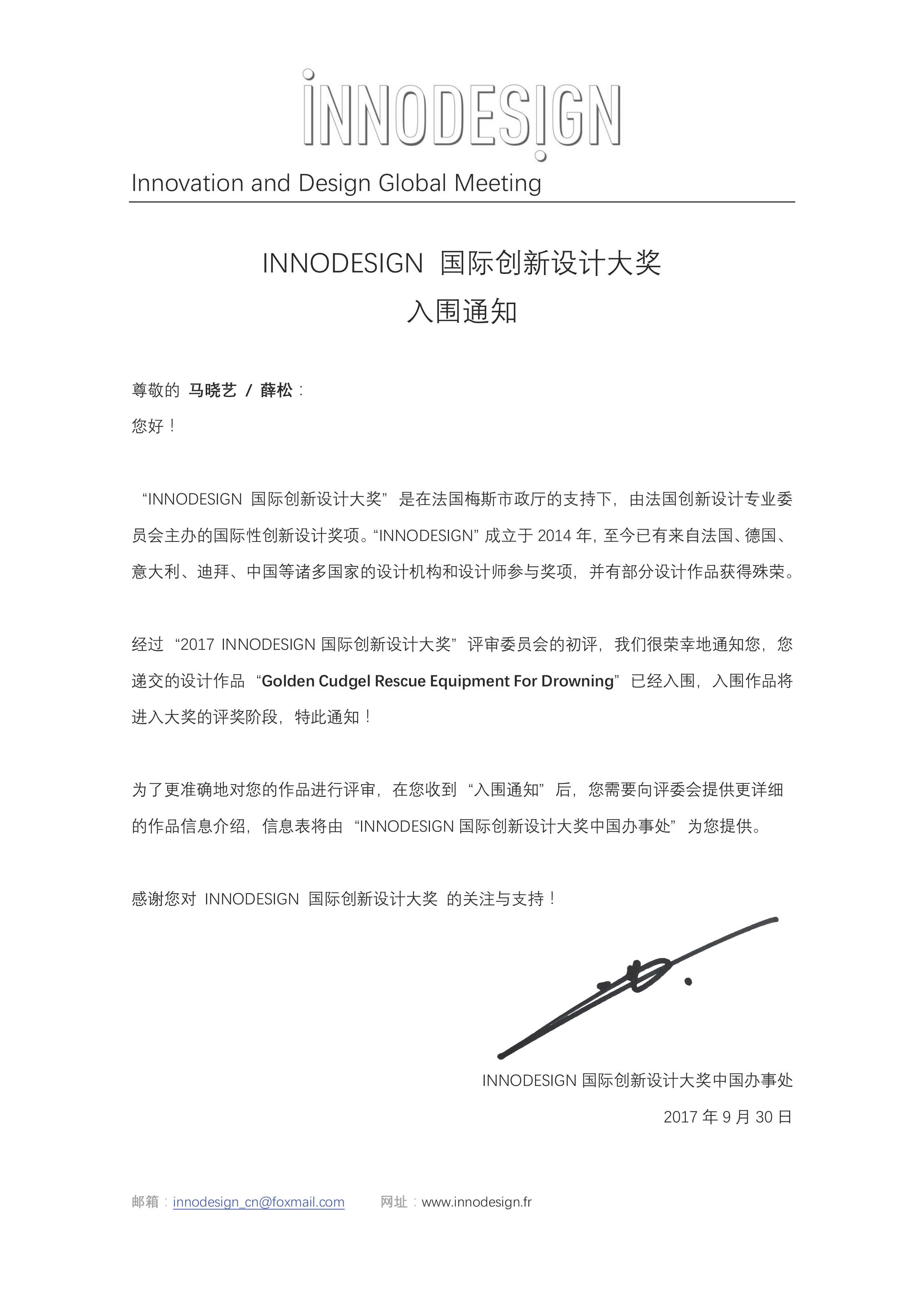 马晓艺和薛松同学在读研期间多次参加各类高水平设计竞赛,成果显著,为参赛并入围“2017 INNODESIGN国际创新设计大奖”奠定良好基础。我校学生的参赛入围,体现了我校学生的良好专业素养,也参与了中法设计交流。