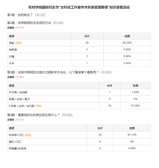 在三八妇女节之际,为提升女科技工作者的学术形象,学院分工会组织女教工“女科技工作者学术形象管理要领”知识答题活动,机械与材料工程学院分工会组织学院女教工积极参加《女科技工作者学术形象管理要领》讲座,中国人物形象设计高等教育首任专业主任陈郁老师进行了“女科技工作者国际学术形象打造”报告。会后学院开展讲座相关内容线上答题活动,受到全院女教工的广泛喜爱,大家积极参与了答题活动。beat365正版唯一入口必一国际妇女节“女科技工作者学术形象管理要领”知识线上答题统计结果如图。
