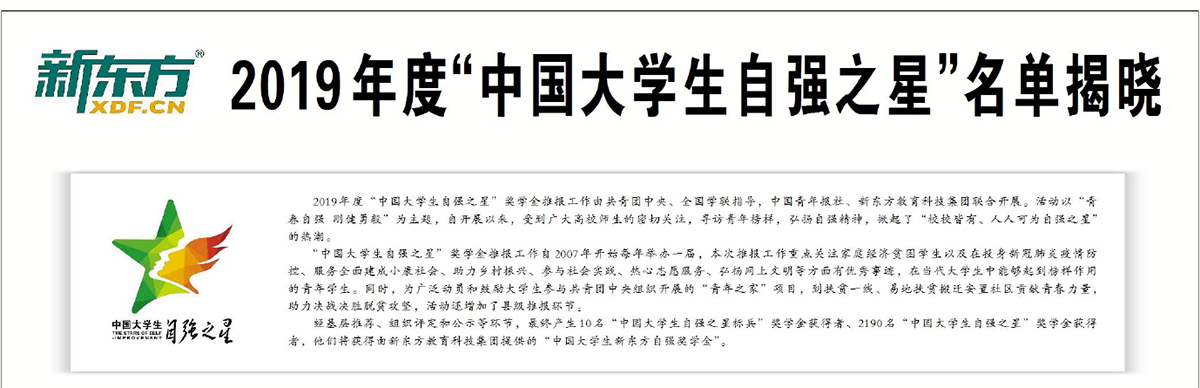 2019年度“中国大学生自强之星”奖学金推报工作由共青团中央、全国学联指导,中国青年报社、新东方教育科技集团联合开展。活动以“青春自强 刚健勇毅”为主题,自开展以来,受到广大高校师生的密切关注,寻访青年榜样,弘扬自强精神,掀起了“校校皆有、人人可为自强之星”的热潮。