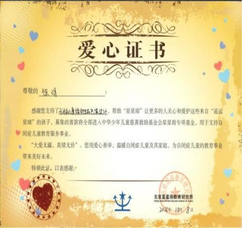 星星雨教育机构为此次提供设计方案的同学颁发了爱心证书,并鼓励同学们的爱心善举。星星雨教育研究所根据最终方案进行打样、生产,并进行义卖。义卖所获得善款将全部进入中华少年儿童慈善救助基金会星星雨专项基金,用于支持自闭症儿童教育服务事业。