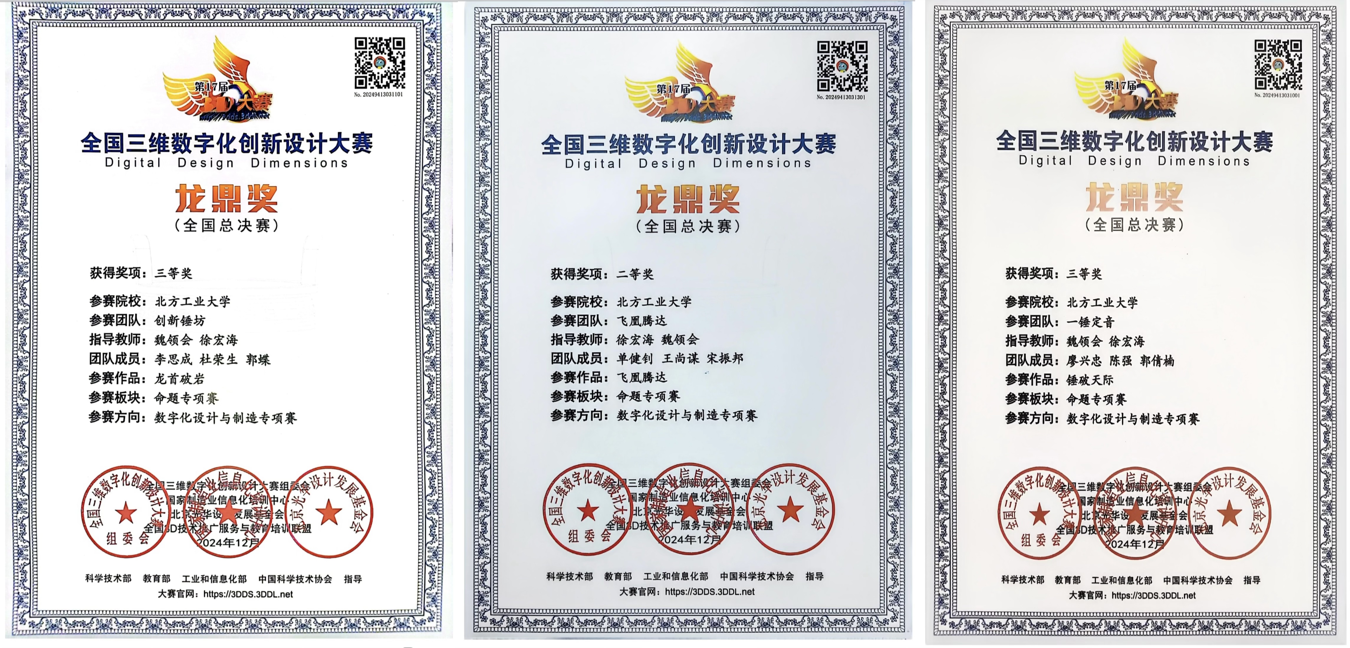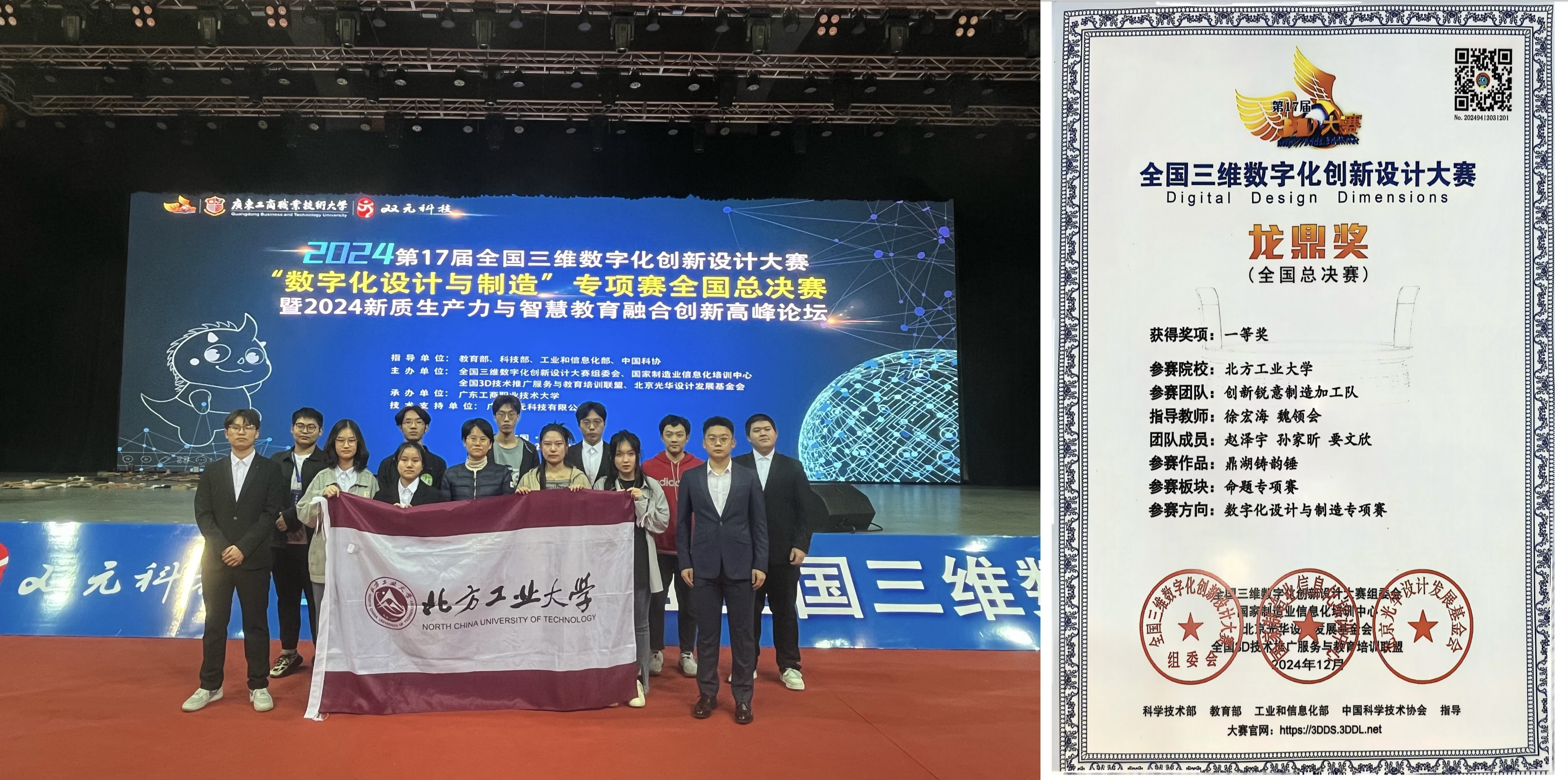 1月29-12月1日,2024全国3D大赛数字化设计与制造专项赛全国总决赛在广东省肇庆市落下帷幕,beat365正版唯一入口必一徐宏海、魏领会老师指导的4支参赛队不畏强手、奋力拼搏,获全国总决赛一等奖1项、二等奖1项、三等奖2项,其中赵泽宇团队获全国总决赛第1名。另外,我校获优秀组织奖,徐宏海老师获优秀指导教师奖。
