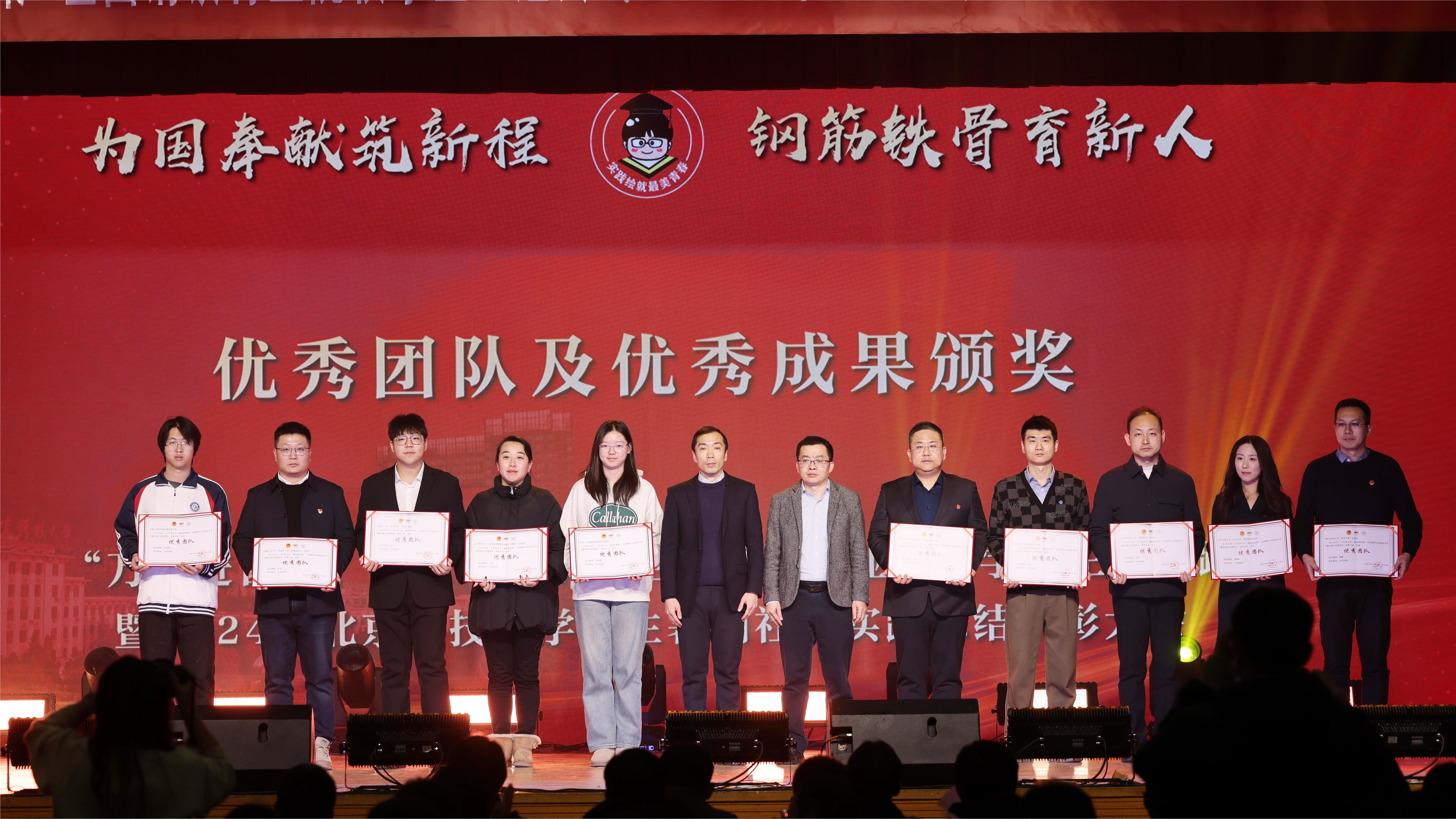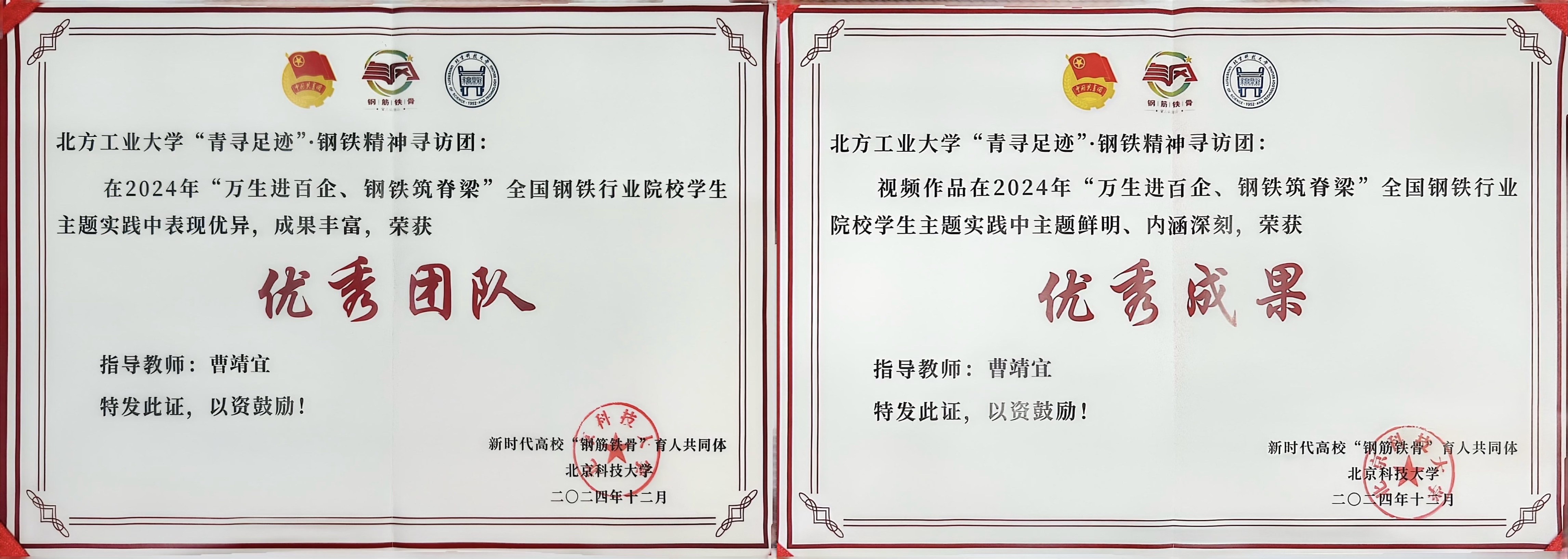 12 月 30 日,由新时代高校“钢筋铁骨”育人共同体、 北京科技大学主办的 2024 年“万生进百企、钢铁筑脊梁” 全国钢铁行业院校学生主题实践总结表彰大会在北京科技 大学召开,我校“‘青寻足迹’钢铁精神寻访团”获评优秀 团队奖和优秀成果奖。实践团队长工设专研 22 班代子琦作 为学生代表,在新时代高校“钢筋铁骨”育人共同体实践育 人工作研讨会上作交流发言。