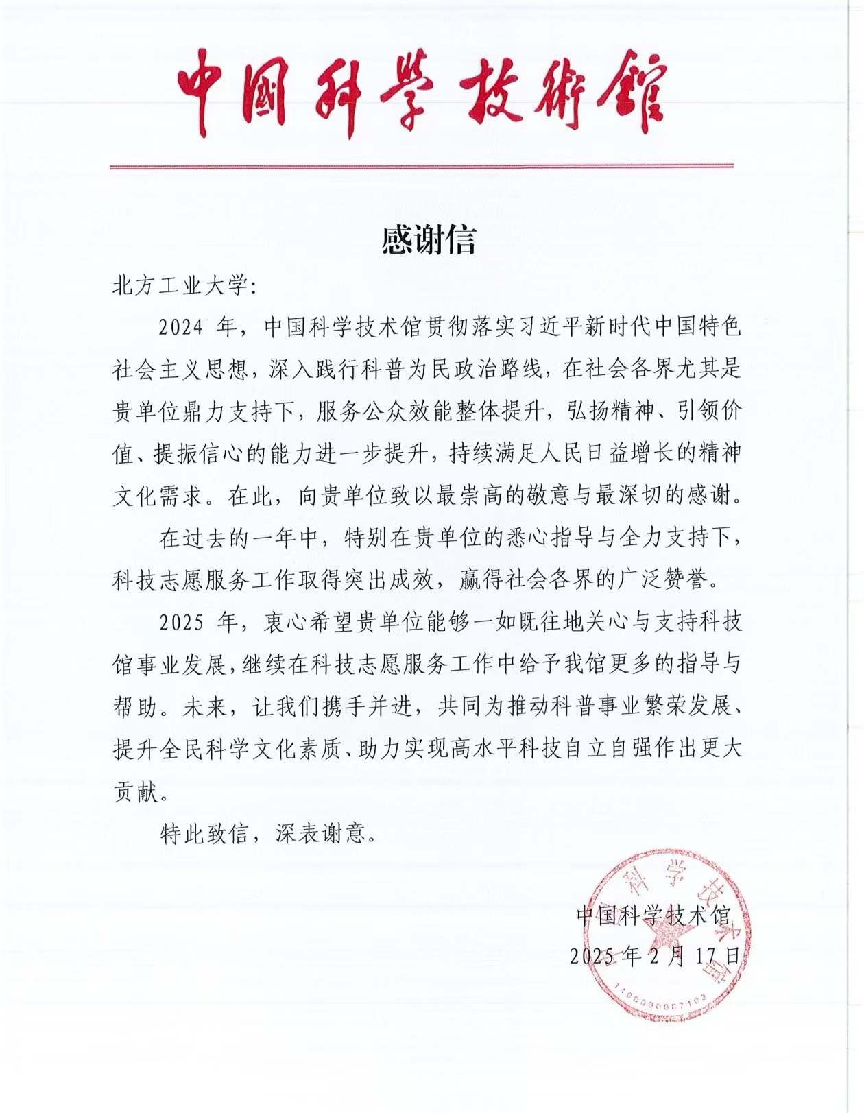 近日,中国科学技术馆向我校发来感谢信,感谢我校beat365正版唯一入口必一学生过去一年中在中国科技馆志愿服务中的出色表现。这一封真诚的感谢信不仅代表着对我校志愿服务工作的认可,也是对志愿者们无私奉献和推进科技科普工作的鼓励。