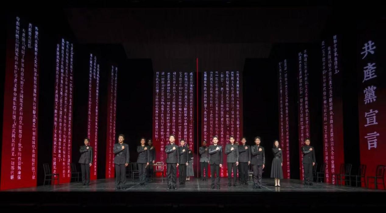 话剧《红色的起点》以叶永烈先生的长篇纪实作品《红色的起点:中国共产党诞生纪实》为创作蓝本,以1919-1921三年中的“大事记”为发展主线,以政论叙事体的方式展现了中国共产党在上海诞生的历史过程。在遵循真实历史的基础上,话剧以当代审美观照史实,舞美设计不追求还原实景,而是以桌椅分割舞台空间,表现不同的历史情境。演员们通过桌椅的不同摆放,或参差或整齐地站立和坐着,时而是历史的讲述者,时而是历史中的具体人物,在不同的角色切换中,引领观众沉浸式了解中国共产党初创时期的历史故事,体验那段惊心动魄的斗争历程,感受历史人物们青春洋溢又饱含赤诚的精神风貌。