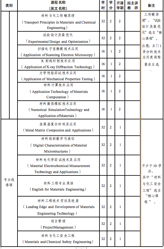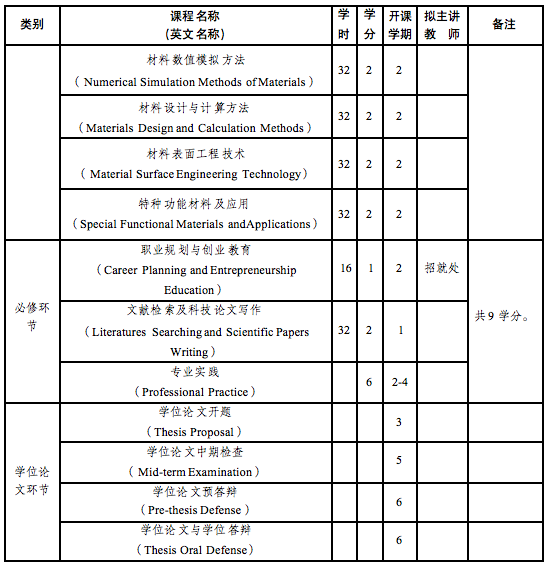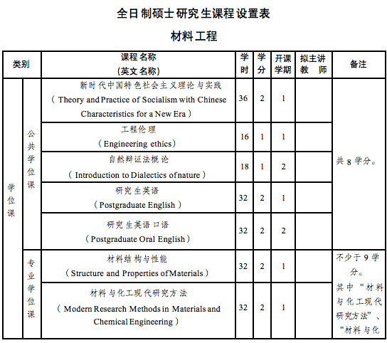 攻读材料工程领域硕士专业学位的研究生,应获得的总学分不少于36学分,其中:公共学位课:共8学分,专业学位课:不少于9学分,专业选修课:不少于10学分,必修环节:共9学分。